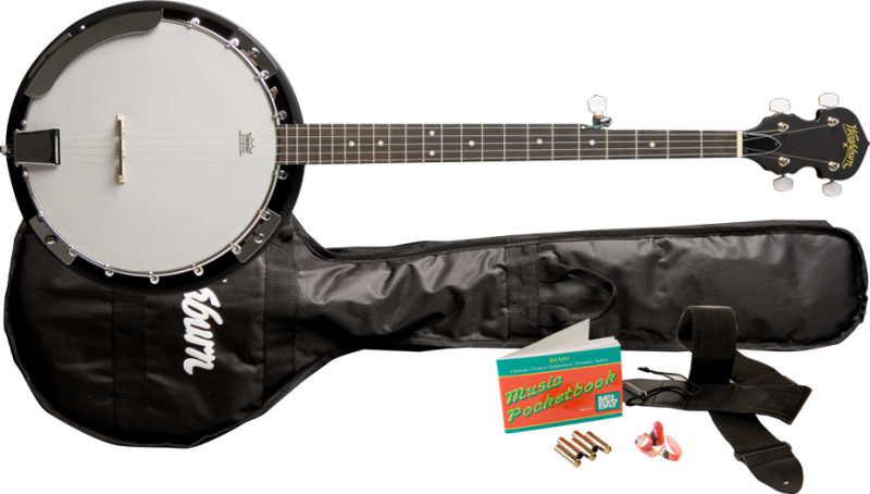 Pack includes banjo, gig bag, picks, pitch pipe, strap and instruction book.5 String Banjo.Chrome Diecast Tuners, D'Addario J60+light gauge nickel strings.Ebony tipped maple bridge for pristine articulation and an engraved gold armrest adds to playing comfortAuthentic Remo? head