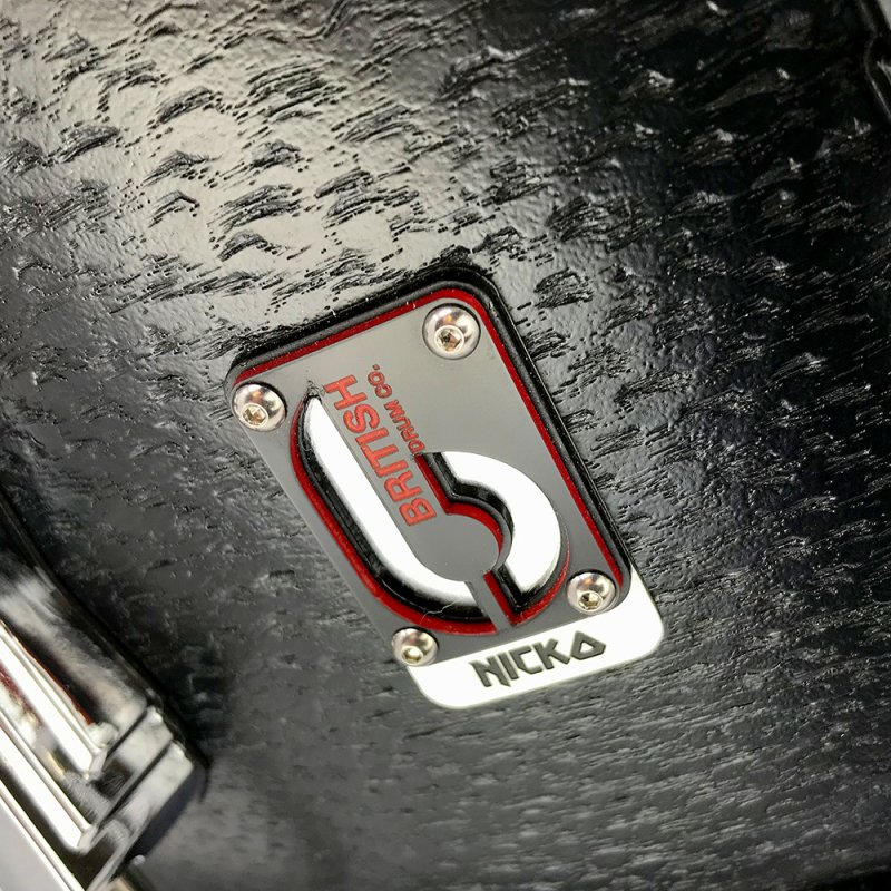 Icarus "B" Badge- The British Drum Co. Icarus name badge, in Black with red detailing, features a laser-engraved nameplate proudly displaying Nickos name in the iconic styling of Iron Maiden.