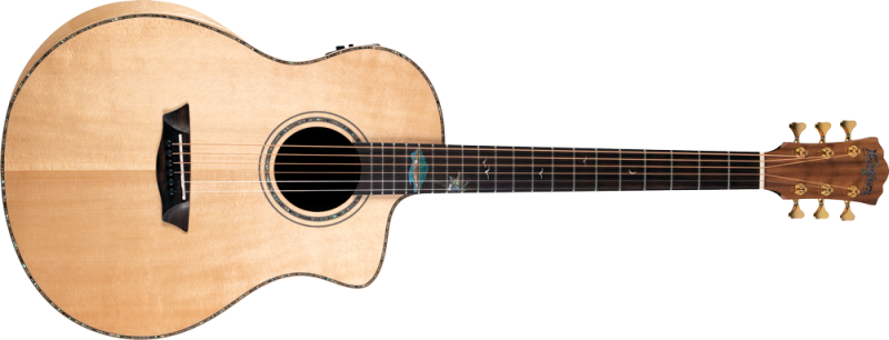 Solid spruce top, acacia back and sides with quarter sawn scalloped Sitka Spruce bracing and preamp.Abalone and Turquoise inlaysMahogany neck with 2 way TrussrodGold diecast tunersD'Addario EXP-16 light set phospher bronze strings