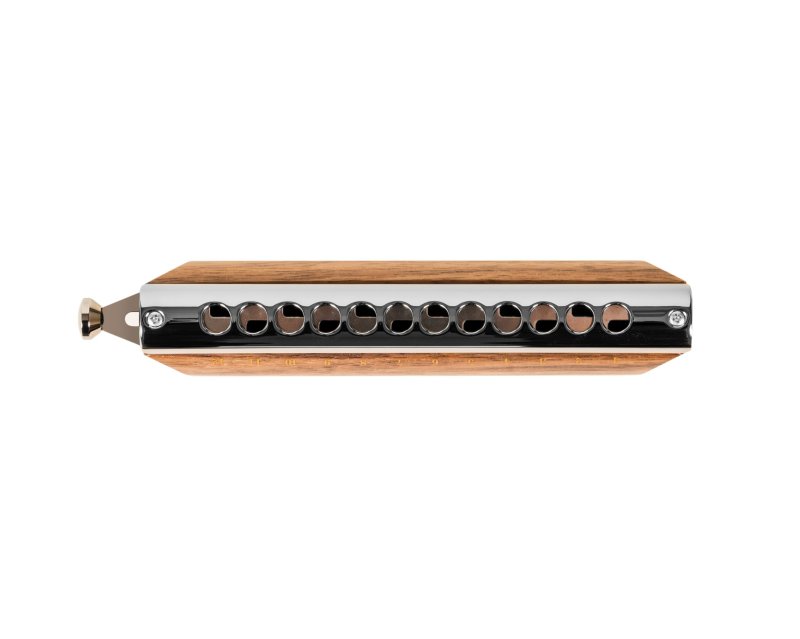 It features a more mellow and dark tone. Walnut is used for the cover, finished in a calm design with a sense of quality. And the volume and shape are decided for the purpose of easy to play, easy to fit in hand, also to have a more dark tone, and to have sufficient strength. It is the world's first mass-production model using wooden cover for chromatic harmonica. The sticking to the sound consistently requested by Mr. Gregoire, it is "dark sound (deep sound)".