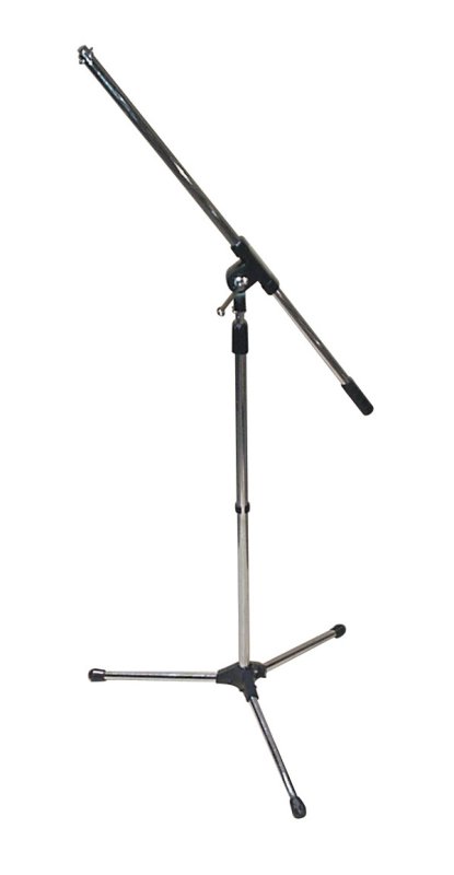Tripod boom stand. Foldable for easy storage and transport. Easy lever adjustable boom. Counterweight. Adjustable height 33.5 - 62. Base spread 14. Chrome.
