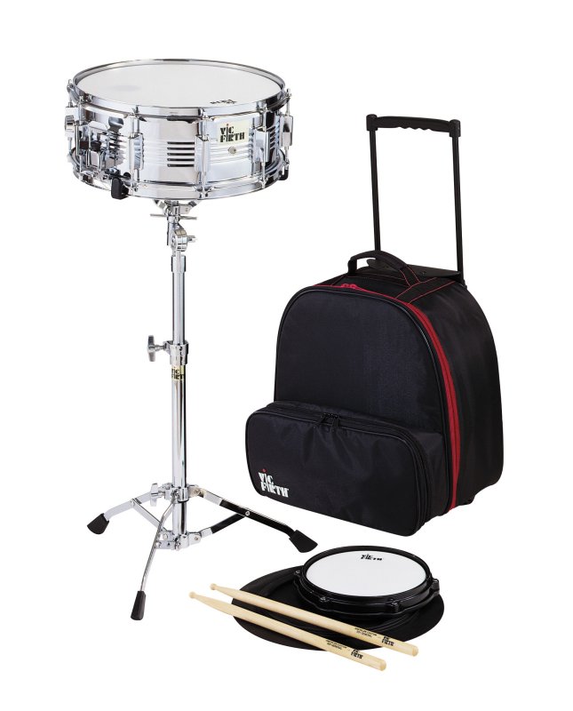 Vic Firth has assembled quite the package deal for your student drummer. This all inclusive snare pack comes with a steel snare drum, a wheeled travel case, a snare stand, a practice pad, a drum key, and a pair of Vic Firth drum sticks!