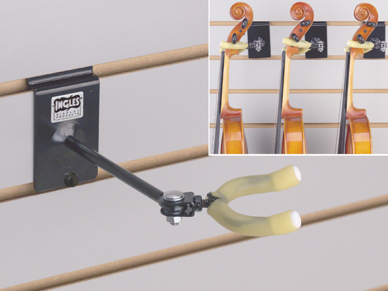 For those who prefer to display stringed instruments left or right facing. The holder has an angle adjustable yolk that allows display of instrument at any angle. The yolk swivels to accommodate the different peg heights and allowing the instrument to hang straight. Fits all size instruments (violin and viola). Protective pads at all contact points. Fits slat wall and slat-style grid.