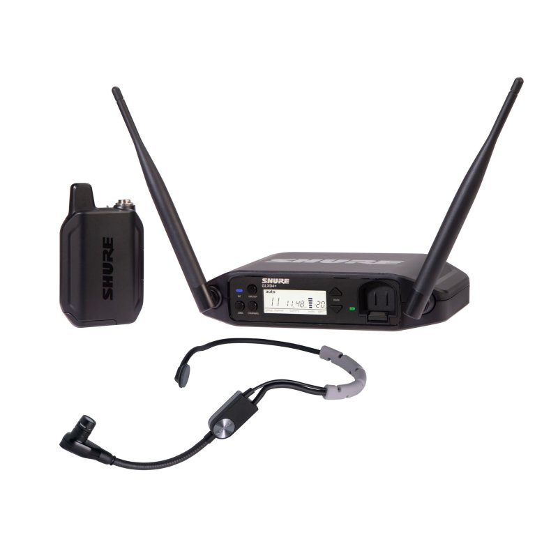 The GLX-D+ Dual Band Wireless Headset System features the durable SM35 Headset Microphone for high-quality headworn vocal performance applications and the GLXD4+ tabletop receiver.