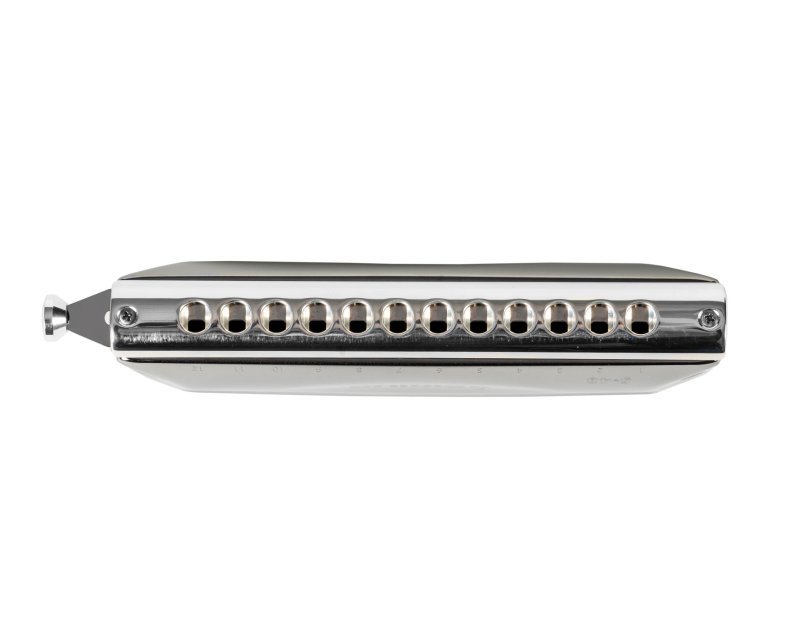 12 hole, 48 note chromatic harmonica. Brass and special plated cover, ABS body, and a brass and special plated mouthpiece. Super long stroke side action.