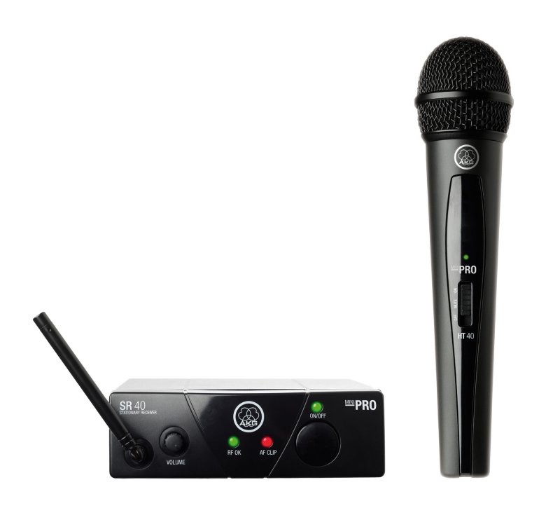 The AKG WMS 40 Mini Vocal Set is a UHF wireless handheld microphone system that is small portable, easy to set up and straightforward to operate. The WMS 40 Mini Vocal Set features the SR 40 mini receiver and HT 40 handheld transmitter. The handheld transmitter features a dynamic capsule with a cardioid polar pattern enclosed in a wire-mesh cap. The transmitter operates for 30 hours on just a single AA battery. The HT 40 transmitter also features an On/Off and Mute switch. The SR 40 receiver features a miniature design and a 1/4" audio output. There are 3 LEDs indicating On/Off and RF status. Operation is fairly straightforward, simply connect the SR 40 to a PA amplifier input, power the HT 40 transmitter and SR 40 receiver and you're ready for wireless speech, performances and more.