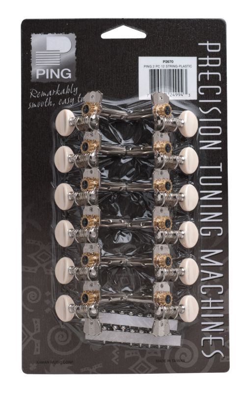 Ping 12-string machines with double-drilled posts for vertical (solid headpiece) or horizontal (slotted headpiece) mounting, nickelplated, open construction with small plastic oval buttons.